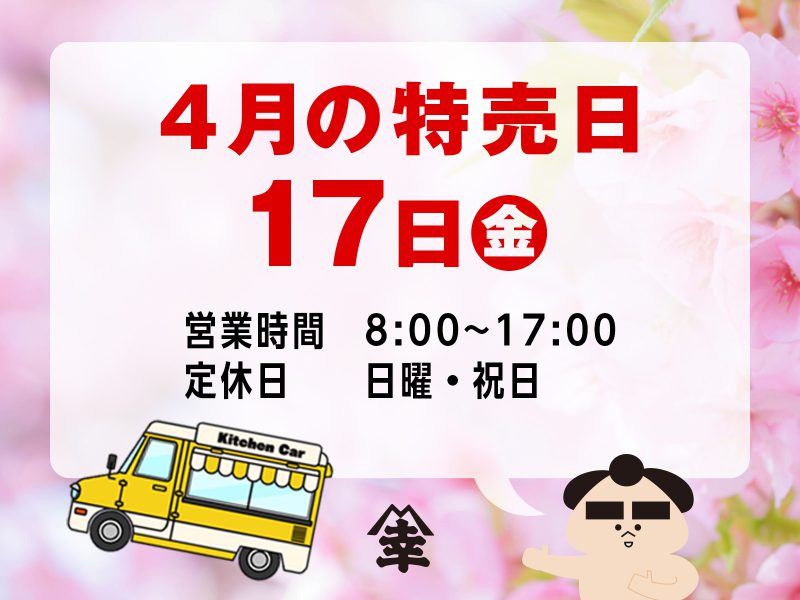 毎月、上総屋本社にて特売を行っておりますが、4月の特売は17日(金)に開催いたします!夕方5時まで開催しておりますので、是非お出かけ下さいませ。スタッフ一同、心よりお待ちしております。
